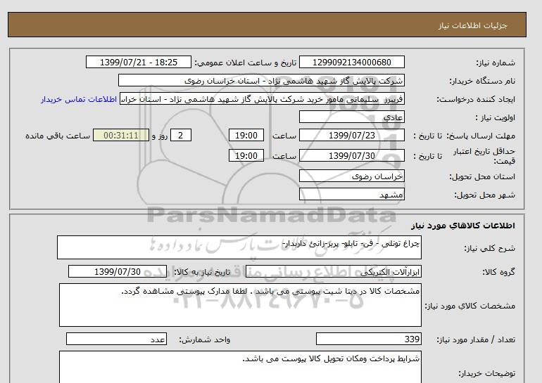 نام دستگاه خریدار:شرکت پالایش گاز شهید هاشمی نژاد - استان خراسان رضوی