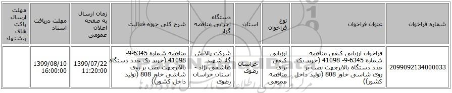 | 2099092134000033 | فراخوان ارزیابی کیفی مناقصه شماره 6345-9- 41098 (خرید یک عدد دستگاه بالابرجهت نصب بر روی شاسی خاور 808 (تولید داخل کشور)) | ارزیابی کیفی برای مناقصه عمومی | خراسان رضوی | شرکت پالایش گاز شهید هاشمی نژاد - استان خراسان رضوی | مناقصه شماره 6345-9- 41098 (خرید یک عدد دستگاه بالابرجهت نصب بر روی شاسی خاور 808 (تولید داخل کشور)) | 1399/07/22 11:20:00 | 1399/08/10 16:00:00 |