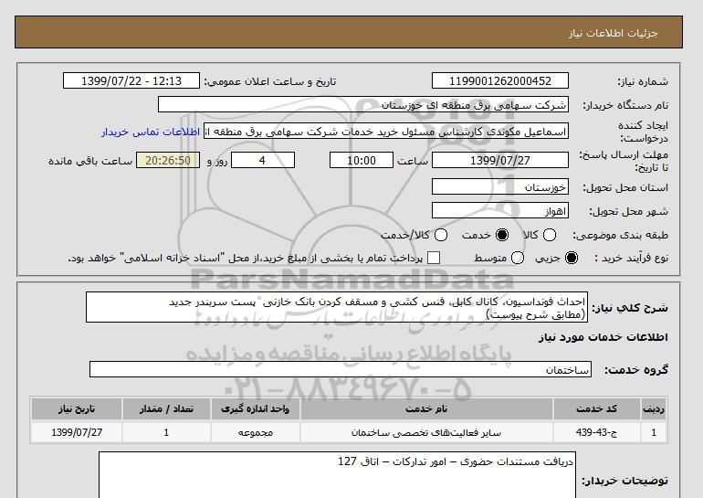 شرح کلی نیاز: احداث فونداسیون، کانال کابل، فنس کشی و مسقف کردن بانک خازنی پست سربندر جدید (مطابق شرح پیوست)