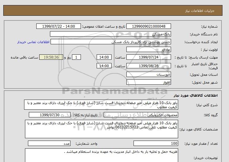 مشخصات کالای مورد نیاز: پاور بانک 10 هزار میلی آمپر صفحه دیجیتال فست شارژ (شارژ فوری) با حک لیزری دارای برند معتبر و با کیفیت مطلوب تلفن تماس 06132215722 نواصر