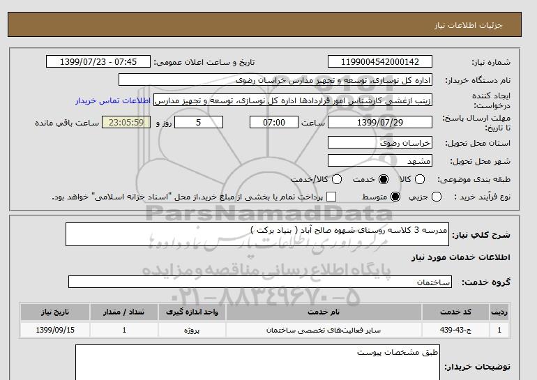 شرح کلی نیاز: مدرسه 3 کلاسه روستای شهوه صالح آباد ( بنیاد برکت )