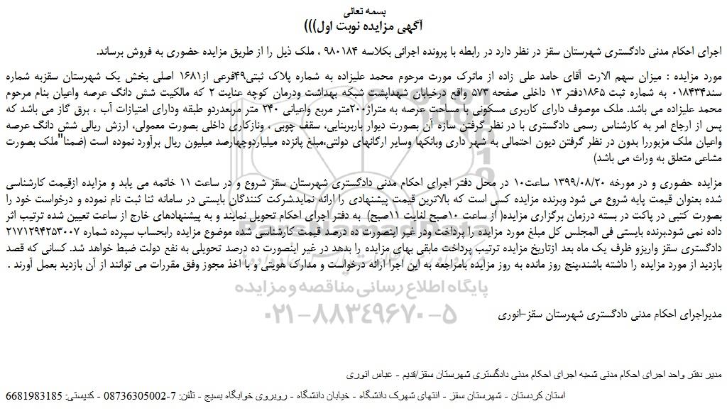 اجرای احکام مدنی دادگستری شهرستان سقز در نظر دارد در رابطه با پرونده اجرائی بکلاسه 980184 ، ملک ذیل را از طریق مزایده حضوری به فروش برساند.
