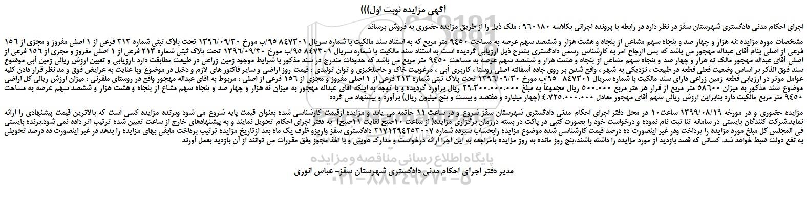 اجرای احکام مدنی دادگستری شهرستان سقز در نظر دارد در رابطه با پرونده اجرائی بکلاسه 960180 ، ملک ذیل را از طریق مزایده حضوری به فروش برساند