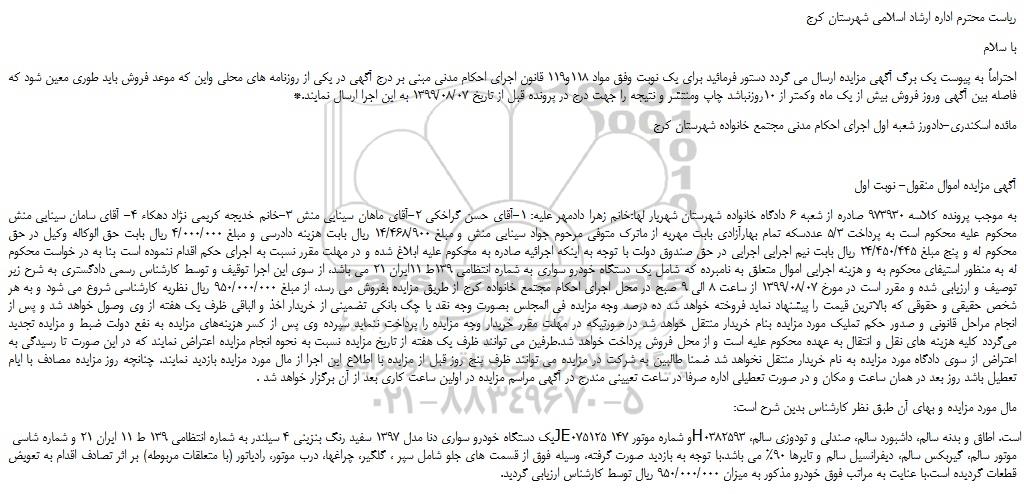 به موجب پرونده کلاسه 973930 صادره از شعبه 6 دادگاه خانواده شهرستان شهریار لها:خانم زهرا دادمهر علیه: 1-آقای حسن گراخکی 2-آقای ماهان سینایی منش 3-خانم خدیجه کریمی نژاد دهکاء 4- آقای سامان سینایی منش محکوم علیه محکوم است به پرداخت 5/3 عددسکه تمام بهارآزادی بابت مهریه از ماترک متوفی مرحوم جواد سینایی منش و مبلغ 14/468/900 ریال بابت هزینه دادرسی و مبلغ 4/000/000 ریال بابت حق الوکاله وکیل در حق محکوم له و پنج مبلغ 24/450/445 ریال بابت نیم اجرایی اجرایی در حق صندوق دولت با توجه به اینکه اجرائیه صادره به محکوم علیه ابلاغ شده و در مهلت مقرر نسبت به اجرای حکم اقدام ننموده است بنا به در خواست محکوم له به منظور استیفای محکوم به و هزینه اجرایی اموال متعلق به نامبرده که شامل یک دستگاه خودرو سواری به شماره انتظامی 139ط 11ایران 21 می باشد، از سوی این اجرا توقیف و توسط کارشناس رسمی دادگستری به شرح زیر توصیف و ارزیابی شده و مقرر است در مورخ 1399/08/07 از ساعت 8 الی 9 صبح در محل اجرای احکام مجتمع خانواده کرج از طریق مزایده بفروش می رسد، از مبلغ 950/000/000 ریال نظریه کارشناسی شروع می شود و به هر شخص حقیقی و حقوقی که بالاترین قیمت را پیشنهاد نماید فروخته خواهد شد ده درصد وجه مزایده فی المجلس بصورت وجه نقد یا چک بانکی تضمینی از خریدار اخذ و الباقی ظرف یک هفته از وی وصول خواهد شد و پس از انجام مراحل قانونی و صدور حکم تملیک مورد مزایده بنام خریدار منتقل خواهد شد در صورتیکه در مهلت مقرر خریدار وجه مزایده را پرداخت ننماید سپرده وی پس از کسر هزینه های مزایده به نفع دولت ضبط و مزایده تجدید می گردد کلیه هزینه های نقل و انتقال به عهده محکوم علیه است و از محل فروش پرداخت خواهد شد.طرفین می توانند ظرف یک هفته از تاریخ مزایده نسبت به نحوه انجام مزایده اعتراض نمایند که در این صورت تا رسیدگی به اعتراض از سوی دادگاه مورد مزایده به نام خریدار منتقل نخواهد شد ضمنا طالبین به شرکت در مزایده می توانند ظرف پنج روز قبل از مزایده با اطلاع این اجرا از مال مورد مزایده بازدید نمایند. چنانچه روز مزایده مصادف با ایام تعطیل باشد روز بعد در همان ساعت و مکان و در صورت تعطیلی اداره صرفا در ساعت تعیینی مندرج در آگهی مراسم مزایده در اولین ساعت کاری بعد از آن برگزار خواهد شد .