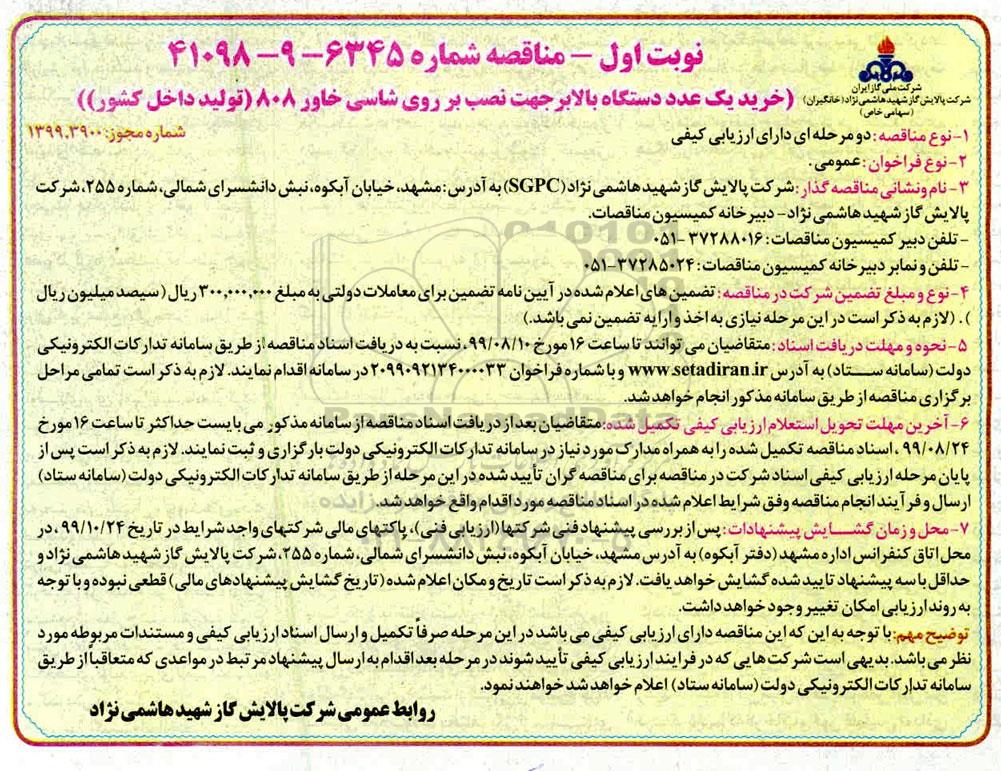 7- محل و زمان گشایش پیشنهادات: پس از بررسی پیشنهاد فنی شرکتها (ارزیابی فنی)، پاکتهای مالی شرکتهای واجد شرایط در تاریخ 99.10.24 ، در محل اتاق کنفرانس اداره مشهد (دفتر آبکوه) به آدرس مشهد، خیابان آبکوه، نبش دانشسرای شمالی، شماره 255، شرکت پالایش گاز شهید هاشمی نژاد و حداقل با دو پیشنهاد تأیید شده گشایش خواهد یافت. لازم به ذکر است تاریخ و مکان اعلام شده (تاریخ گشایش پیشنهادهای مالی) قطعی نبوده و با توجه به روند ارزیابی امکان تغییر وجود خواهد داشت