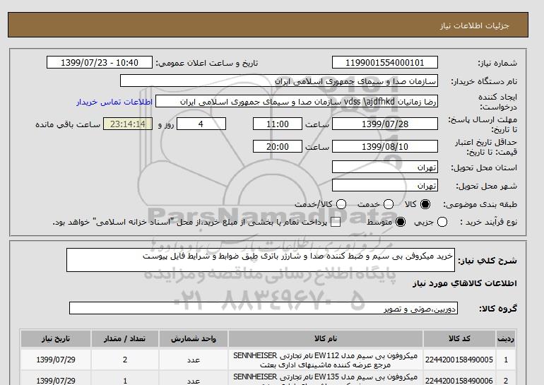 شرح کلی نیاز: خرید میکروفن بی سیم و ضبط کننده صدا و شارژر باتری طبق ضوابط و شرایط فایل پیوست