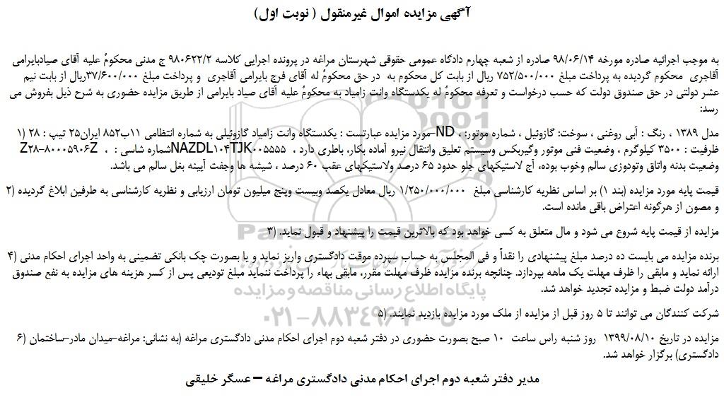 به موجب اجرائیه صادره مورخه 98/06/14 صادره از شعبه چهارم دادگاه عمومی حقوقی شهرستان مراغه در پرونده اجرایی کلاسه 980622/2 ج مدنی محکومٌ علیه آقای صیادبایرامی آقاجری  محکوم گردیده به پرداخت مبلغ 752/500/000 ریال از بابت کل محکوم به  در حق محکومٌ له آقای فرج بایرامی آقاجری  و پرداخت مبلغ 37/600/000ریال از بابت نیم عشر دولتی در حق صندوق دولت که حسب درخواست و تعرفه محکومٌ له یکدستگاه وانت زامیاد به محکومٌ علیه آقای صیاد بایرامی از طریق مزایده حضوری به شرح ذیل بفروش می رسد: