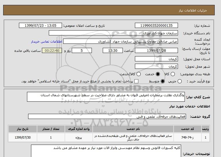 شرح کلی نیاز: واگذاری نظارت برعملیات اجرایی قنوان به مشاور دارای صلاحیت در سطح شهرستانهای شمال استان