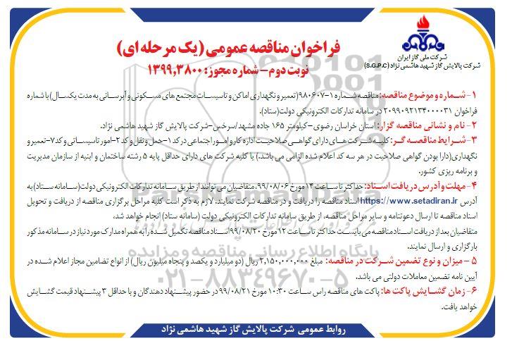 2- نام و نشانی مناقصه گزار: استان خراسان رضوی - کیلومتر 165 جاده مشهد / سرخس - شرکت پالایش گاز شهید هاشمی نژاد