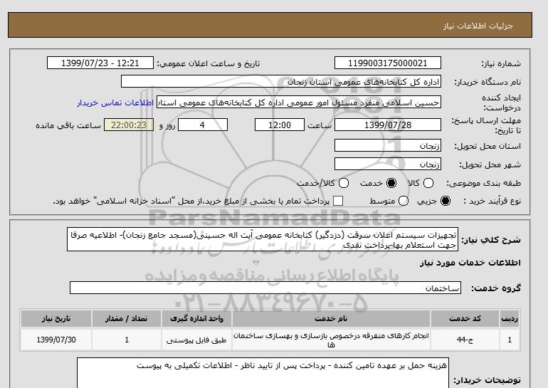 شرح کلی نیاز: تجهیزات سیستم اعلان سرقت (دزدگیر) کتابخانه عمومی آیت اله حسینی(مسجد جامع زنجان)- اطلاعیه صرفا جهت استعلام بها-پرداخت نقدی