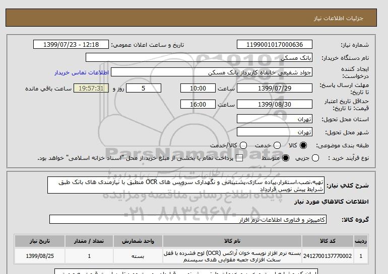 استعلام بها و موضوع استعلام استعلام تهیه،نصب،استقرار،پیاده سازی،پشتیبانی و نگهداری سرویس های OCR منطبق با نیازمندی های بانک طبق شرایط پیش نویس قرارداد به اطلاع کلیه شرکتها و افراد متخصص واجد شرایط میرساند، آگهی گذار در نظر دارد از طریق استعلام بها، نسبت به انتخاب و دریافت پیشنهادات اقدام نماید. این استعلام با کد آگهی ثبت شده در سامانه خبرگزاری پارس نماد : 2792333 منتشر شده است. مشخصات استعلام : تاریخ شروع استعلام: 1399/07/23 آخرین مهلت ارسال پیشنهاد قیمت : 1399/07/28 و محل اجرای پروژه : استان تهران میباشد. استعلام قیمت مورد درخواست : استعلام تهیه،نصب،استقرار،پیاده سازی،پشتیبانی و نگهداری سرویس های OCR منطبق با نیازمندی های بانک طبق شرایط پیش نویس قرارداد با دستهبندیهای تخصصی و گروه های مرتبط : کامپیوتر, اتوماسیون اداری, استعلام اطلاع رسانی میگردد. شرایط شرکت در استعلام آنلاین : ابتدا ثبت نام در سامانه استعلام پارس نماد و تکمیل مدارک موردنیاز و بارگذاری در سامانه رعایت تمامی ضوابط و الزامات مندرج در اسناد استعلام است.