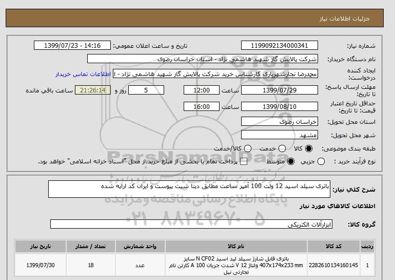 شرح کلی نیاز: باتری سیلد اسید 12 ولت 100 آمپر ساعت مطابق دیتا شیت پیوست و ایران کد ارایه شده