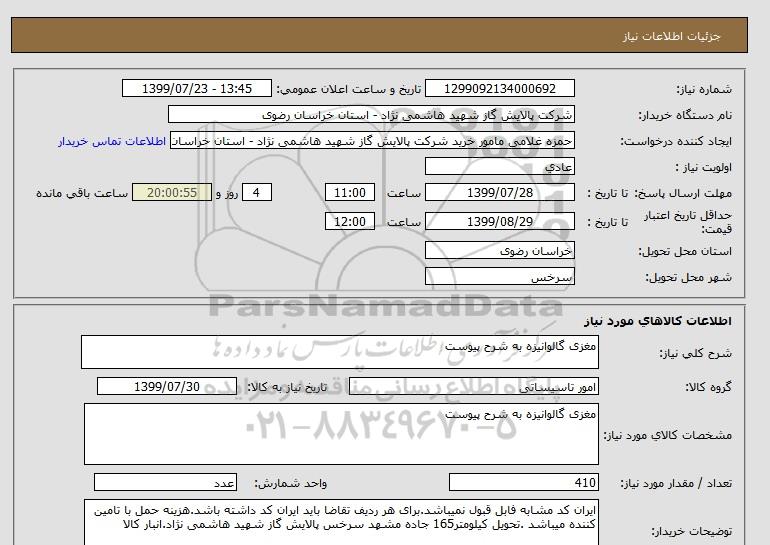 نام دستگاه خریدار:شرکت پالایش گاز شهید هاشمی نژاد - استان خراسان رضوی