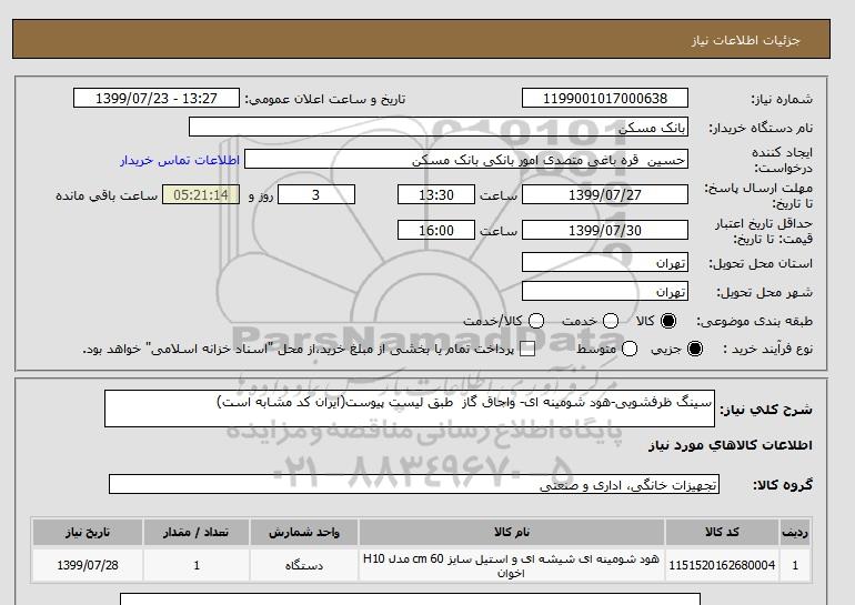 استعلام بها و موضوع استعلام استعلام سینگ ظرفشویی-هود شومینه ای- واجاق گاز طبق لیست پیوست(ایران کد مشابه است) به اطلاع کلیه شرکتها و افراد متخصص واجد شرایط میرساند، آگهی گذار در نظر دارد از طریق استعلام بها، نسبت به انتخاب و دریافت پیشنهادات اقدام نماید. این استعلام با کد آگهی ثبت شده در سامانه خبرگزاری پارس نماد : 2793338 منتشر شده است. مشخصات استعلام : تاریخ شروع استعلام: 1399/07/23 آخرین مهلت ارسال پیشنهاد قیمت : 1399/07/27 و محل اجرای پروژه : استان تهران میباشد. استعلام قیمت مورد درخواست : استعلام سینگ ظرفشویی-هود شومینه ای- واجاق گاز طبق لیست پیوست(ایران کد مشابه است) با دستهبندیهای تخصصی و گروه های مرتبط : لوازم خانگی, سرویس های بهداشتی, استعلام اطلاع رسانی میگردد. شرایط شرکت در استعلام آنلاین : ابتدا ثبت نام در سامانه استعلام پارس نماد و تکمیل مدارک موردنیاز و بارگذاری در سامانه رعایت تمامی ضوابط و الزامات مندرج در اسناد استعلام است.