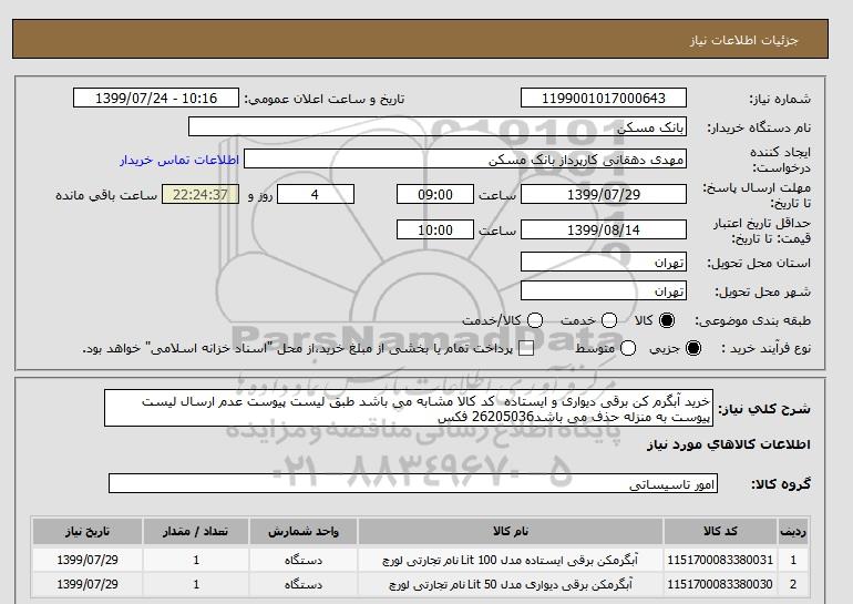 شرح کلی نیاز: خرید آبگرم کن برقی دیواری و ایستاده کد کالا مشابه می باشد طبق لیست پیوست عدم ارسال لیست پیوست به منزله حذف می باشد26205036 فکس