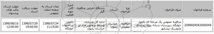 | 2099004542000049 | مناقصه عمومی یک مرحله ای تکمیل خوابگاه دبیرستان شبانه روزی روستای ماروسک نیشابور | مناقصه عمومی | خراسان رضوی | اداره کل نوسازی، توسعه و تجهیز مدارس خراسان رضوی | تکمیل ساختمان خوابگاه | 1399/07/24 11:15:00 | 1399/07/29 19:00:00 | 1399/08/10 12:00:00 |