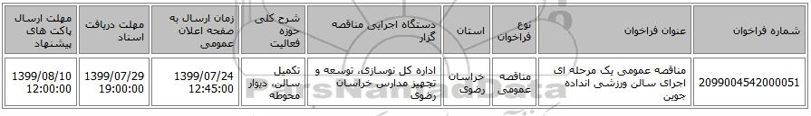 | 2099004542000051 | مناقصه عمومی یک مرحله ای اجرای سالن ورزشی انداده جوین | مناقصه عمومی | خراسان رضوی | اداره کل نوسازی، توسعه و تجهیز مدارس خراسان رضوی | تکمیل سالن، دیوار محوطه | 1399/07/24 12:45:00 | 1399/07/29 19:00:00 | 1399/08/10 12:00:00 |