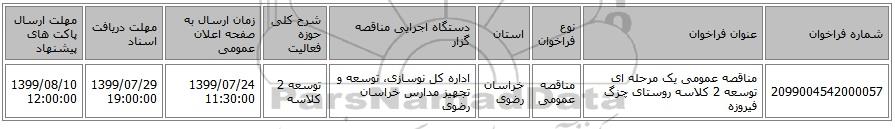 | 2099004542000057 | مناقصه عمومی یک مرحله ای توسعه 2 کلاسه روستای چزگ فیروزه | مناقصه عمومی | خراسان رضوی | اداره کل نوسازی، توسعه و تجهیز مدارس خراسان رضوی | توسعه 2 کلاسه | 1399/07/24 11:30:00 | 1399/07/29 19:00:00 | 1399/08/10 12:00:00 |