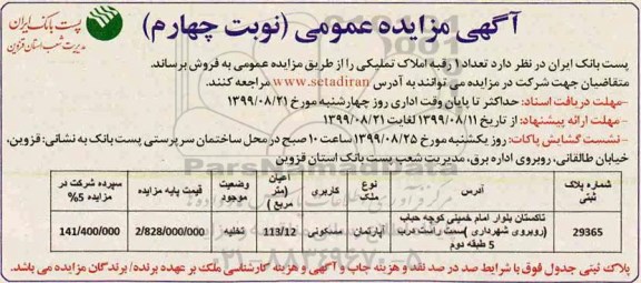مزایده عمومی مزایده فروش 1 رقبه املاک تملیکی نوبت چهارم برگزار میگردد. از کلیه افراد متخصص و شرکت‌های واجد شرایط دعوت به عمل می‌آید تا در این مزایده با کد خبرگزاری پارس نماد : 2796360 شرکت نمایند تاریخ شروع مزایده : 1399/07/27 مهلت شرکت در مزایده: تا پایان روز 1399/08/21 مکان برگزاری اموال واگذاری استان‌های قزوین و دسته‌بندی‌های مربوط به این حراجی املاک و زمین میباشد.