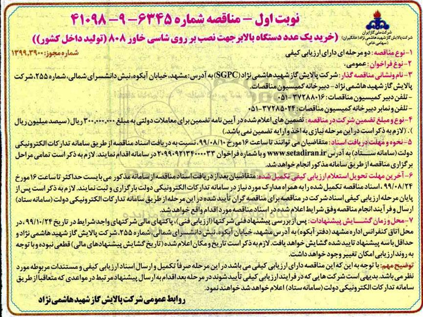 7- محل و زمان گشایش پیشنهادات: پس از بررسی پیشنهاد فنی شرکتها (ارزیابی فنی)، پاکتهای مالی شرکتهای واجد شرایط در تاریخ 99.10.24 ، در محل اتاق کنفرانس اداره مشهد (دفتر آبکوه) به آدرس مشهد، خیابان آبکوه، نبش دانشسرای شمالی، شماره 255، شرکت پالایش گاز شهید هاشمی نژاد و حداقل با دو پیشنهاد تأیید شده گشایش خواهد یافت. لازم به ذکر است تاریخ و مکان اعلام شده (تاریخ گشایش پیشنهادهای مالی) قطعی نبوده و با توجه به روند ارزیابی امکان تغییر وجود خواهد داشت