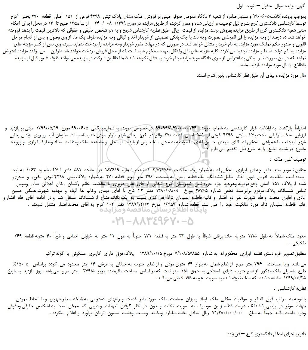بموجب پرونده کلاسه9900605 و دستور صادره از شعبه 3 دادگاه عمومی حقوقی مبنی بر فروش ملک مشاع پلاک ثبتی 4298 فرعی از 151 اصلی قطعه 270 بخش کرج توسط کارشناسی دادگستری کرج بشرح ذیل توصیف و ارزیابی شده و مقرر گردیده از طریق مزایده در مورخ 1399/ 08 / 24 از ساعت12 صبح تا 13 در محل اجرای احکام مدنی شعبه دادگستری کرج از طریق مزایده بفروش برسد. مزایده از قیمت ریال طبق نظریه کارشناس شروع و به هر شخص حقیقی و حقوقی که بالاترین قیمت را بدهد فروخته خواهد شد. ده درصد از وجه مزایده را فی المجلس بصورت وجه نقد یا چک بانکی تضمینی از خریدار اخذ و الباقی وجه مزایده ظرف یک ماه از وی وصول و پس از انجام مراحل قانونی و صدور حکم تملیک مورد مزایده به نام خریدار منتقل خواهد شد. در صورتی که در مهلت مقرر خریدار وجه مزایده را پرداخت ننماید سپرده وی پس از کسر هزینه های مزایده به نفع دولت ضبط و مزایده تجدید می گردد. کلیه هزینه های نقل وانتقال بعهده محکوم علیه است که از محل فروش پرداخت خواهد شد طرفین می توانند مزایده اعتراض نمایند که در این صورت تا رسیدگی به اعتراض از سوی دادگاه مورد مزایده بنام خریدار منتقل نخواهد شد ضمنا طالبین شرکت در مزایده می توانند ظرف 5 روز قبل از مزایده بااطلاع از مال مورد مزایده بازدید نمایند.