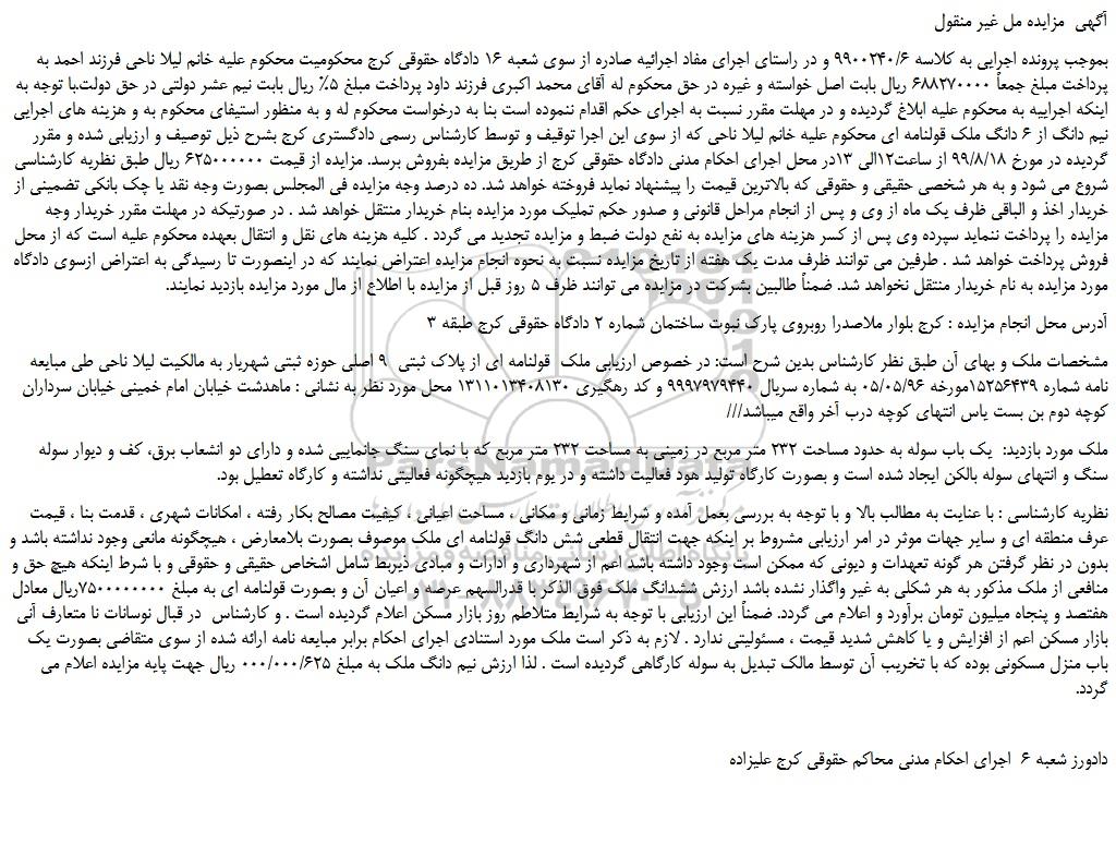 بموجب پرونده اجرایی به کلاسه 9900240/6 و در راستای اجرای مفاد اجرائیه صادره از سوی شعبه 16 دادگاه حقوقی کرج محکومیت محکوم علیه خانم لیلا ناحی فرزند احمد به پرداخت مبلغ جمعاً 688270000 ریال بابت اصل خواسته و غیره در حق محکوم له آقای محمد اکبری فرزند داود پرداخت مبلغ 5% ریال بابت نیم عشر دولتی در حق دولت.با توجه به اینکه اجراییه به محکوم علیه ابلاغ گردیده و در مهلت مقرر نسبت به اجرای حکم اقدام ننموده است بنا به درخواست محکوم له و به منظور استیفای محکوم به و هزینه های اجرایی نیم دانگ از 6 دانگ ملک قولنامه ای محکوم علیه خانم لیلا ناحی که از سوی این اجرا توقیف و توسط کارشناس رسمی دادگستری کرج بشرح ذیل توصیف و ارزیابی شده و مقرر گردیده در مورخ 99/8/18 از ساعت12الی 13در محل اجرای احکام مدنی دادگاه حقوقی کرج از طریق مزایده بفروش برسد. مزایده از قیمت 625000000 ریال طبق نظریه کارشناسی شروع می شود و به هر شخصی حقیقی و حقوقی که بالاترین قیمت را پیشنهاد نماید فروخته خواهد شد. ده درصد وجه مزایده فی المجلس بصورت وجه نقد یا چک بانکی تضمینی از خریدار اخذ و الباقی ظرف یک ماه از وی و پس از انجام مراحل قانونی و صدور حکم تملیک مورد مزایده بنام خریدار منتقل خواهد شد . در صورتیکه در مهلت مقرر خریدار وجه مزایده را پرداخت ننماید سپرده وی پس از کسر هزینه های مزایده به نفع دولت ضبط و مزایده تجدید می گردد . کلیه هزینه های نقل و انتقال بعهده محکوم علیه است که از محل فروش پرداخت خواهد شد . طرفین می توانند ظرف مدت یک هفته از تاریخ مزایده نسبت به نحوه انجام مزایده اعتراض نمایند که در اینصورت تا رسیدگی به اعتراض ازسوی دادگاه مورد مزایده به نام خریدار منتقل نخواهد شد. ضمناً طالبین بشرکت در مزایده می توانند ظرف 5 روز قبل از مزایده با اطلاع از مال مورد مزایده بازدید نمایند.