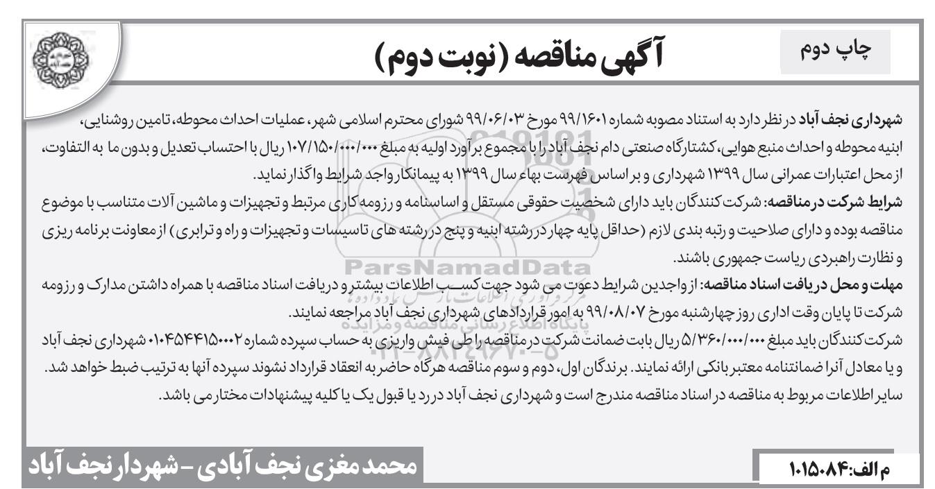 شهرداری نجف آباد در نظر دارد به استناد مصوبه شماره 99/1601 مورخ 99.6.3 شورای محترم اسلامی شهر عملیات احداث محوطه، تامین روشنایی، ابنیه محوطه و احداث منبع هوایی کشتارگاه صنعتی دام نجف آباد را با مجموع براورد اولیه به مبلغ 107.150.000.000 ریال با احتساب تعدیل و بدون مابه التفاوت، از محل اعتبارات عمرانی سال 1399 شهرداری و براساس فهرست بها سال 1399 به پیمانکار واجد شرایط واگذار نماید.