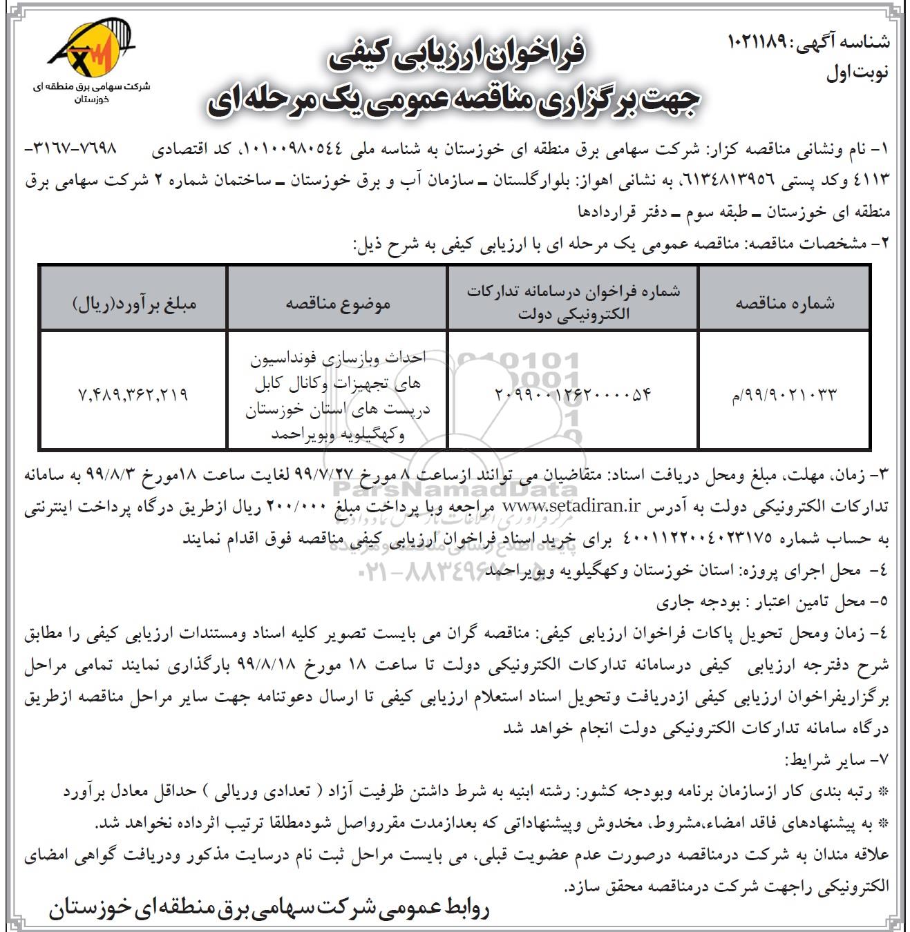 | 99/9021033/م | 2099001262000054 | احداث و بازسازی فونداسیون های تجهیزات و کانال کابل در پست های استان خوزستان و کهگیلویه و بویراحمد | 7.489.362.219 |