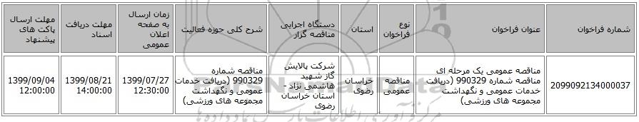 مناقصه، مناقصه عمومی یک مرحله ای مناقصه شماره 990329 (دریافت خدمات عمومی و نگهداشت مجموعه های ورزشی) , مناقصه عمومی یک مرحله ای مناقصه شماره 990329 (دریافت خدمات عمومی و نگهداشت مجموعه های ورزشی)