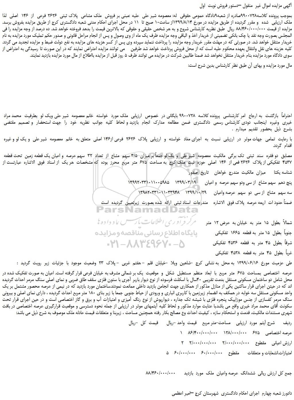 بموجب پرونده کلاسه9900728صادره از شعبه9دادگاه عمومی حقوقی له: معصومه شیر علی علیه :مبنی بر فروش ملک مشاعی پلاک ثبتی 2626 فرعی از 146 اصلی لذا ملک ارزیابی شده و مقرر گردیده از طریق مزایده در مورخ 1399/8/14از ساعت10 صبح تا 11 در محل اجرای احکام مدنی شعبه دادگستری کرج از طریق مزایده بفروش برسد. مزایده از قیمت 88/460/000/000 ریال طبق نظریه کارشناس شروع و به هر شخص حقیقی و حقوقی که بالاترین قیمت را بدهد فروخته خواهد شد. ده درصد از وجه مزایده را فی المجلس بصورت وجه نقد یا چک بانکی تضمینی از خریدار اخذ و الباقی وجه مزایده ظرف یک ماه از وی وصول و پس از انجام مراحل قانونی و صدور حکم تملیک مورد مزایده به نام خریدار منتقل خواهد شد. در صورتی که در مهلت مقرر خریدار وجه مزایده را پرداخت ننماید سپرده وی پس از کسر هزینه های مزایده به نفع دولت ضبط و مزایده تجدید می گردد. کلیه هزینه های نقل وانتقال بعهده محکوم علیه است که از محل فروش پرداخت خواهد شد طرفین می توانند مزایده اعتراض نمایند که در این صورت تا رسیدگی به اعتراض از سوی دادگاه مورد مزایده بنام خریدار منتقل نخواهد شد ضمنا طالبین شرکت در مزایده می توانند ظرف 5 روز قبل از مزایده بااطلاع از مال مورد مزایده بازدید نمایند.