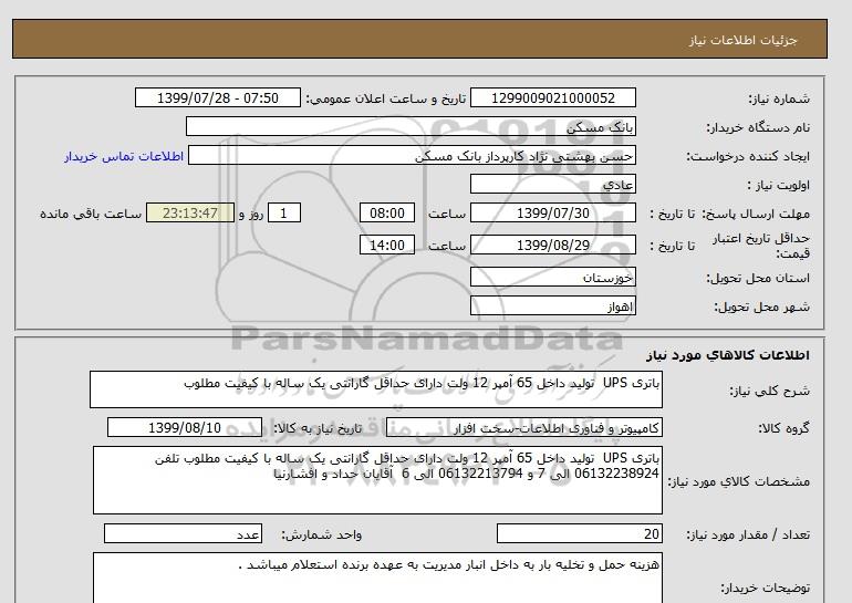 مشخصات کالای مورد نیاز: باتری UPS تولید داخل 65 آمپر 12 ولت دارای حداقل گارانتی یک ساله با کیفیت مطلوب تلفن 06132238924 الی 7 و 06132213794 الی 6 آقایان حداد و افشارنیا