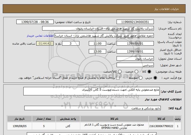 نام دستگاه خریدار:شرکت پالایش گاز شهید هاشمی نژاد - استان خراسان رضوی