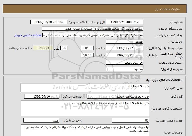 نام دستگاه خریدار:شرکت پالایش گاز شهید هاشمی نژاد - استان خراسان رضوی