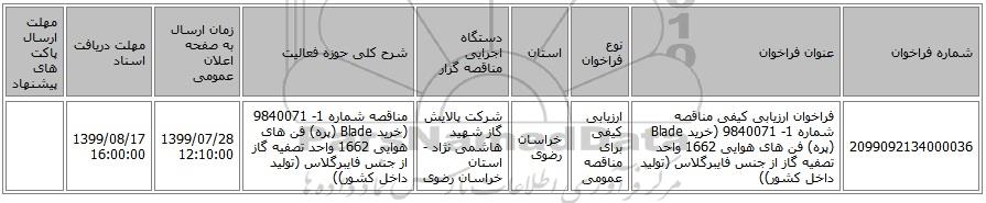 مناقصه، فراخوان ارزیابی کیفی مناقصه شماره 1- 9840071 (خرید Blade (پره) فن های هوایی 1662 واحد تصفیه گاز از جنس فایبرگلاس (تولید داخل کشور)), فراخوان ارزیابی کیفی مناقصه شماره 1- 9840071 (خرید Blade (پره) فن های هوایی 1662 واحد تصفیه گاز از جنس فایبرگلاس (تولید داخل کشور))