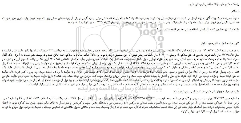به موجب پرونده کلاسه 9900337 صادره از شعبه اول دادگاه خانواده شهرستان ساوجبلاغ لها: خانم سولماز افتخاری علیه: آقای سجاد حیدری محکوم علیه محکوم است به پرداخت 313 عددسکه تمام بهارآزادی بابت اصل خواسته و مبلغ 1/378/845 ریال بابت هزینه دادرسی در حق محکوم له و مبلغ 400/000 ریال بابت نیم عشر دولتی در حق صندوق دولت با توجه به اینکه اجرائیه صادره به محکوم علیه ابلاغ شده و در مهلت مقرر نسبت به اجرای حکم اقدام ننموده است بنا به در خواست محکوم له به منظور استیفای محکوم به و هزینه اجرایی اموال متعلق به نامبرده که شامل یک دستگاه خودرو سواری پراید به شماره انتظامی 857 د 83 ایران 68 می باشد، از سوی این اجرا توقیف و توسط کارشناس رسمی دادگستری به شرح زیر توصیف و ارزیابی شده و مقرر است در مورخ 1399/08/25 از ساعت 8 الی 9 صبح در محل اجرای احکام مجتمع خانواده کرج از طریق مزایده بفروش می رسد، ازمبلغ 600/000/000 ریال نظریه کارشناسی شروع می شود و به هر شخص حقیقی و حقوقی که بالاترین قیمت را پیشنهاد نماید فروخته خواهد شد ده درصد وجه مزایده فی المجلس بصورت وجه نقد یا چک بانکی تضمینی از خریدار اخذ و الباقی ظرف یک هفته از وی وصول خواهد شد و پس از انجام مراحل قانونی و صدور حکم تملیک مورد مزایده بنام خریدار منتقل خواهد شد در صورتیکه در مهلت مقرر خریدار وجه مزایده را پرداخت ننماید سپرده وی پس از کسر هزینه های مزایده به نفع دولت ضبط و مزایده تجدید می گردد کلیه هزینه های نقل و انتقال به عهده محکوم علیه است و از محل فروش پرداخت خواهد شد. طرفین می توانند ظرف یک هفته از تاریخ مزایده نسبت به نحوه انجام مزایده اعتراض نمایند که در این صورت تا رسیدگی به اعتراض از سوی دادگاه مورد مزایده به نام خریدار منتقل نخواهد شد ضمنا طالبین به شرکت در مزایده می توانند ظرف پنج روز قبل از مزایده با اطلاع این اجرا از مال مورد مزایده بازدید نمایند. چنانچه روز مزایده مصادف با ایام تعطیل باشد روز بعد در همان ساعت ومکان و در صورت تعطیلی اداره صرفا در ساعت تعیینی مندرج در آگهی مراسم مزایده در اولین ساعت کاری بعد از آن برگزار خواهد شد .