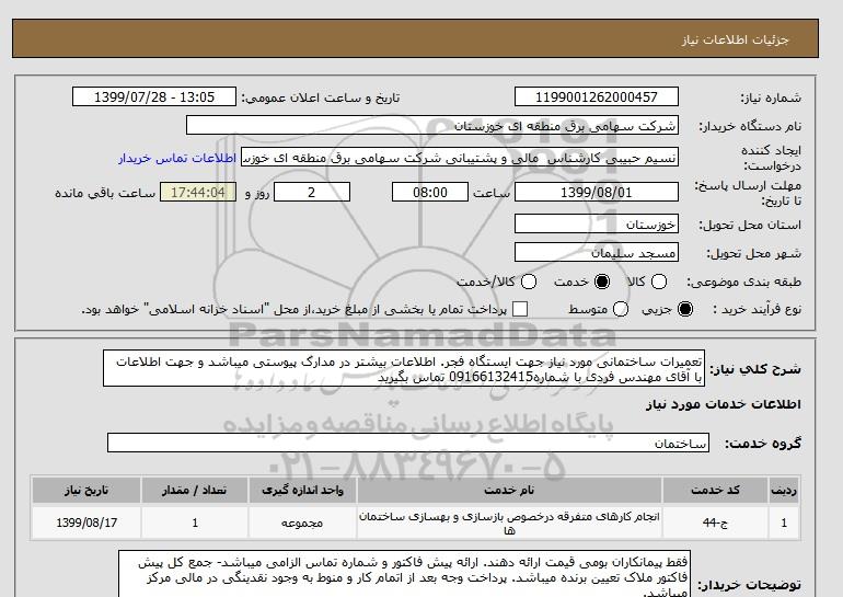 شرح کلی نیاز: تعمیرات ساختمانی مورد نیاز جهت ایستگاه فجر. اطلاعات بیشتر در مدارک پیوستی میباشد و جهت اطلاعات با آقای مهندس فردی با شماره09166132415 تماس بگیرید