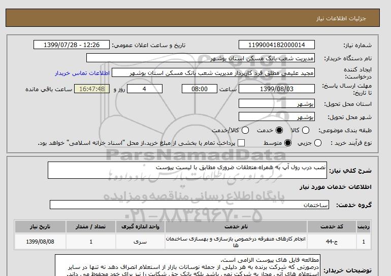 شرح کلی نیاز: نصب درب رول آپ به همراه متعلقات ضروری مطابق با لیست پیوست