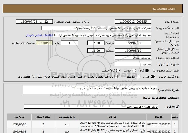 شرح کلی نیاز: پنج قلم باتری خودرویی مطابق ایرانکد ارایه شده و دیتا شیت پیوست