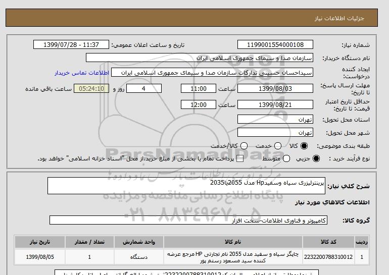 شرح کلی نیاز: پرینترلیزری سیاه وسفیدHp مدل 2055یا2035