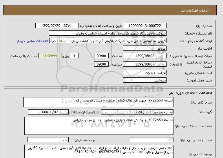 نام دستگاه خریدار:شرکت پالایش گاز شهید هاشمی نژاد - استان خراسان رضوی