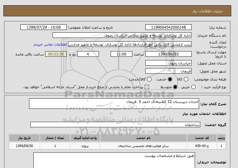 شرح کلی نیاز: احداث دبیرستان 12 کلاسه آل احمد 3 فریمان