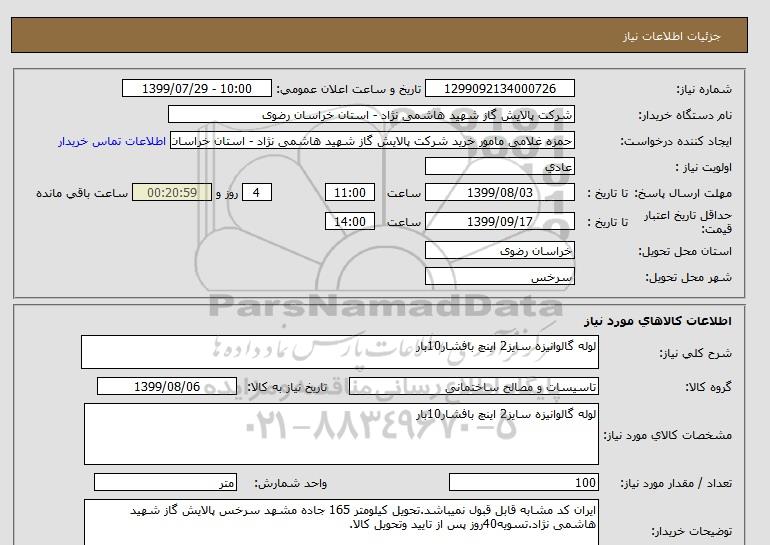 نام دستگاه خریدار:شرکت پالایش گاز شهید هاشمی نژاد - استان خراسان رضوی
