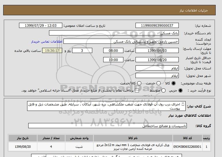شرح کلی نیاز: اجرای درب رول آپ فولادی جهت شعب ملکشاهی، دره شهر، آبدانان . سرابله. طبق مشخصات ذیل و فایل پیوست
