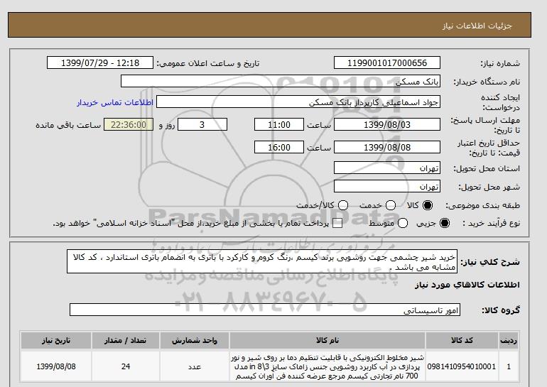 استعلام بها و موضوع استعلام استعلام خرید شیر چشمی جهت روشویی برند کیسم ،رنگ کروم و کارکرد با باتری به انضمام باتری استاندارد ، کد کالا مشابه می باشد . به اطلاع کلیه شرکتها و افراد متخصص واجد شرایط میرساند، آگهی گذار در نظر دارد از طریق استعلام بها، نسبت به انتخاب و دریافت پیشنهادات اقدام نماید. این استعلام با کد آگهی ثبت شده در سامانه خبرگزاری پارس نماد : 2806062 منتشر شده است. مشخصات استعلام : تاریخ شروع استعلام: 1399/07/29 آخرین مهلت ارسال پیشنهاد قیمت : 1399/08/02 و محل اجرای پروژه : استان تهران میباشد. استعلام قیمت مورد درخواست : استعلام خرید شیر چشمی جهت روشویی برند کیسم ،رنگ کروم و کارکرد با باتری به انضمام باتری استاندارد ، کد کالا مشابه می باشد . با دستهبندیهای تخصصی و گروه های مرتبط : تاسیسات ساختمانی, شیرآلات, استعلام اطلاع رسانی میگردد. شرایط شرکت در استعلام آنلاین : ابتدا ثبت نام در سامانه استعلام پارس نماد و تکمیل مدارک موردنیاز و بارگذاری در سامانه رعایت تمامی ضوابط و الزامات مندرج در اسناد استعلام است.