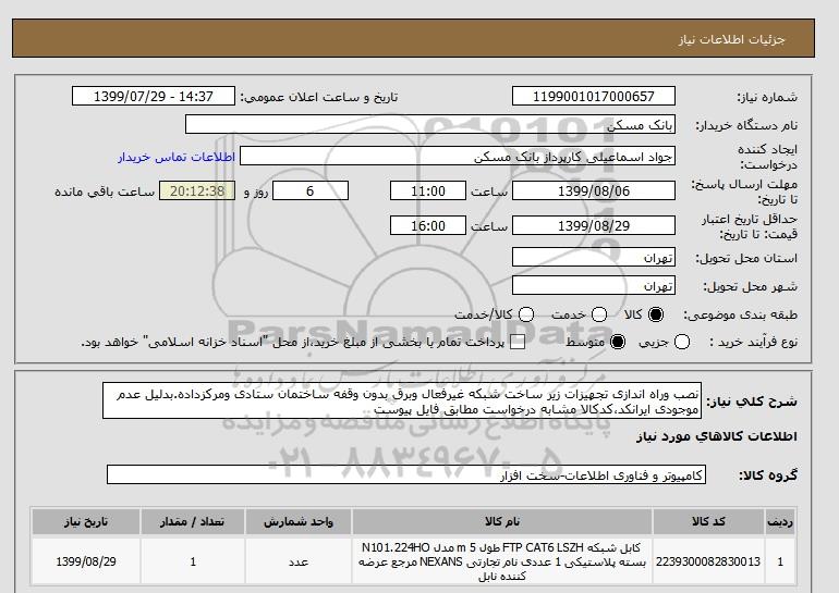 استعلام بها و موضوع استعلام استعلام نصب وراه اندازی تجهیزات زیر ساخت شبکه غیرفعال وبرق بدون وقفه ساختمان ستادی ومرکزداده.بدلیل عدم موجودی ایرانکد،کدکالا مشابه درخواست مطابق فایل پیوست به اطلاع کلیه شرکتها و افراد متخصص واجد شرایط میرساند، آگهی گذار در نظر دارد از طریق استعلام بها، نسبت به انتخاب و دریافت پیشنهادات اقدام نماید. این استعلام با کد آگهی ثبت شده در سامانه خبرگزاری پارس نماد : 2807008 منتشر شده است. مشخصات استعلام : تاریخ شروع استعلام: 1399/07/29 آخرین مهلت ارسال پیشنهاد قیمت : 1399/08/05 و محل اجرای پروژه : استان تهران میباشد. استعلام قیمت مورد درخواست : استعلام نصب وراه اندازی تجهیزات زیر ساخت شبکه غیرفعال وبرق بدون وقفه ساختمان ستادی ومرکزداده.بدلیل عدم موجودی ایرانکد،کدکالا مشابه درخواست مطابق فایل پیوست با دستهبندیهای تخصصی و گروه های مرتبط : سیم و کابل, کامپیوتر, اینترنت شبکه, تجهیزات مخابرات, استعلام اطلاع رسانی میگردد. شرایط شرکت در استعلام آنلاین : ابتدا ثبت نام در سامانه استعلام پارس نماد و تکمیل مدارک موردنیاز و بارگذاری در سامانه رعایت تمامی ضوابط و الزامات مندرج در اسناد استعلام است.