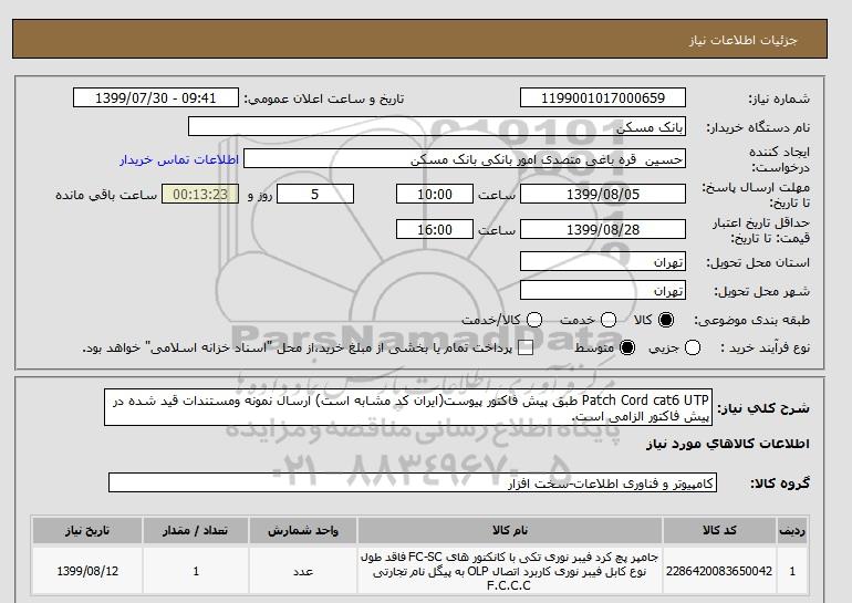 شرح کلی نیاز: Patch Cord cat6 UTP طبق پیش فاکتور پیوست(ایران کد مشابه است) ارسال نمونه ومستندات قید شده در پیش فاکتور الزامی است.
