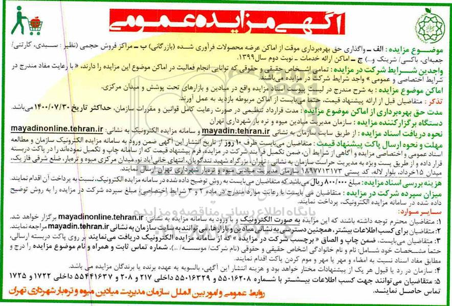 موضوع مزایده: الف - واگذاری حق بهره برداری موقت از اماکن عرضه محصولات فرآوری شده (بازرگانی) ب - مراکز فروش حجمی (نظیر:سبدی، کارتنی/ جعبه ای، باکسی / شرینک و...) ج- امکان ارائه خدمات - نوبت دوم سال 1399