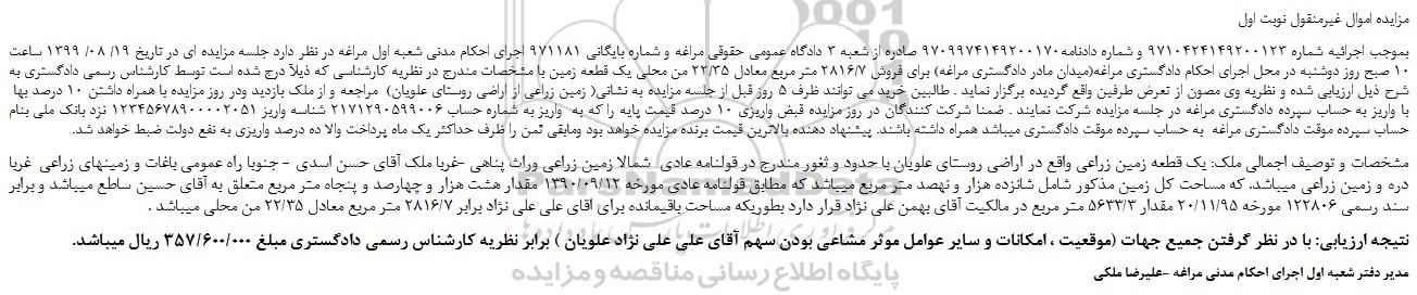 بموجب اجرائیه شماره 9710424149200123 و شماره دادنامه9709974149200170 صادره از شعبه 3 دادگاه عمومی حقوقی مراغه و شماره بایگانی 971181 اجرای احکام مدنی شعبه اول مراغه در نظر دارد جلسه مزایده ای در تاریخ 19/ 08/ 1399 ساعت 10 صبح روز دوشنبه در محل اجرای احکام دادگستری مراغه(میدان مادر دادگستری مراغه) برای فروش 2816/7 متر مربع معادل 22/35 من محلی یک قطعه زمین با مشخصات مندرج در نظریه کارشناسی که ذیلآ درج شده است توسط کارشناس رسمی دادگستری به شرح ذیل ارزیابی شده و نظریه وی مصون از تعرض طرفین واقع گردیده برگزار نماید . طالبین خرید می توانند ظرف 5 روز قبل از جلسه مزایده به نشانی( زمین زراعی از اراضی روستای علویان) مراجعه و از ملک بازدید ودر روز مزایده با همراه داشتن 10 درصد بها با واریز به حساب سپرده دادگستری مراغه در جلسه مزایده شرکت نمایند . ضمنا شرکت کنندگان در روز مزایده قبض واریزی 10 درصد قیمت پایه را که به واریز به شماره حساب 2171290599006 شناسه واریز 12345678900002051 نزد بانک ملی بنام حساب سپرده موقت دادگستری مراغه به حساب سپرده موقت دادگستری میباشد همراه داشته باشند. پیشنهاد دهنده بالاترین قیمت برنده مزایده خواهد بود ومابقی ثمن را ظرف حداکثر یک ماه پرداخت والا ده درصد واریزی به نفع دولت ضبط خواهد شد.