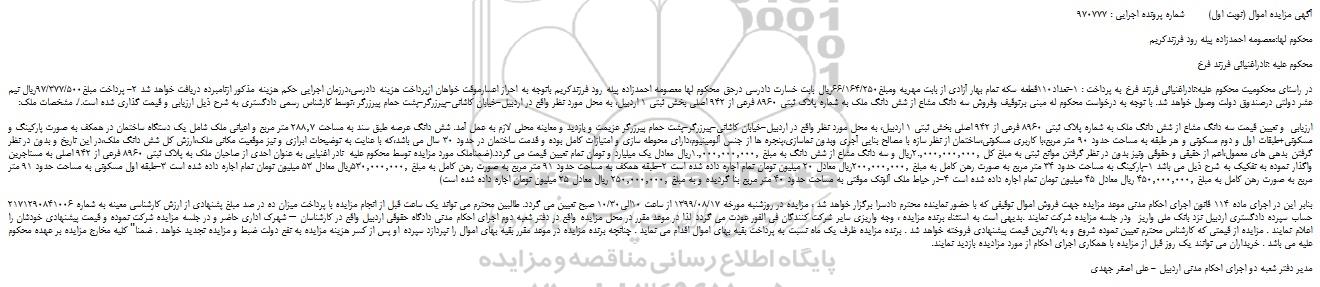 آگهی مزایده اموال (نوبت اول) شماره پرونده اجرایی : 970777