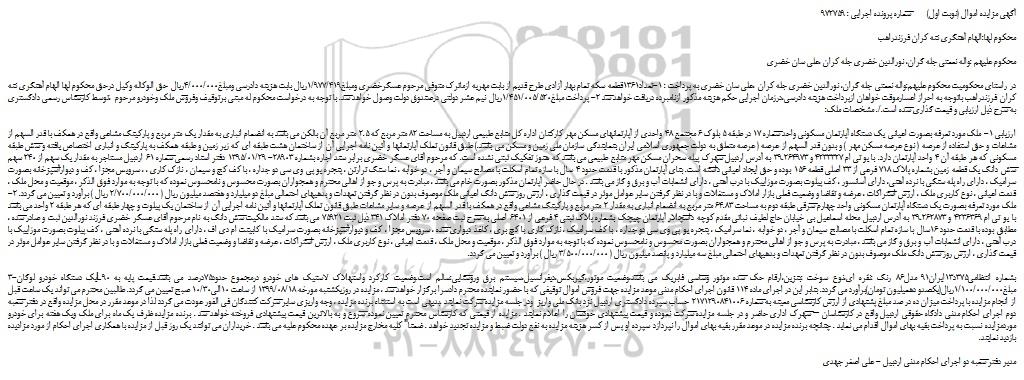 3-یک دستگاه خودرو لوگانL90 بشماره انتظامی375د13ایران91 مدل86 رنگ :نقره ای،نوع سوخت :بنزین،ارقام حک شده موتور وشاسی فابریک می باشد،وضعیت موتور،گیربکس،دیفرانسیل،سیستم برق وروشنایی:سالم است.وضعیت کارکرد واستهلاک لاستیک های خودرو درمجموع حدود75درصد می باشد.قیمت پایه به مبلغ1/100/000/000ریال(یکصدو دهمیلیون تومان)برآورد می گردد. بنابر این در اجرای ماده 114 قانون اجرای احکام مدنی موعد مزایده جهت فروش اموال توقیفی که با حضور نماینده محترم دادسرا برگزار خواهد شد ، مزایده در روزیکشنبه مورخه 1399/08/18 از ساعت 10الی10/30 صبح تعیین می گردد. طالبین محترم می تواند یک ساعت قبل از انجام مزایده با پرداخت میزان ده در صد مبلغ پشنهادی از ارزش کارشناسی معینه به شماره 2171290841006 حساب سپرده دادگستری اردبیل نزد بانک ملی واریز ودر جلسه مزایده شرکت نمایند .بدیهی است به استثناء برنده مزایده ، وجه واریزی سایر شرکت کنندگان فی الفور عودت می گردد لذا در موعد مقرر در محل مزایده واقع در دفتر شعبه دوم اجرای احکام مدنی دادگاه حقوقی اردبیل واقع در کارشناسان – شهرک اداری حاضر و در جلسه مزایده شرکت نموده و قیمت پیشنهادی خودشان را اعلام نمایند . مزایده از قیمتی که کارشناس محترم تعیین نموده شروع و به بالاترین قیمت پیشنهادی فروخته خواهد شد . برنده مزایده ظرف یک ماه برای ملک ویک هفته برای خودرو موردمزایده نسبت به پرداخت بقیه بهای اموال اقدام می نماید . چنانچه برنده مزایده در موعد مقرر بقیه بهای اموال را نپردازد سپرده او پس از کسر هزینه مزایده به نفع دولت ضبط و مزایده تجدید خواهد . ضمنا" کلیه مخارج مزایده بر عهده محکوم علیه می باشد . خریداران می توانند یک روز قبل از مزایده با همکاری اجرای احکام از مورد مزادیده بازدید نمایند.